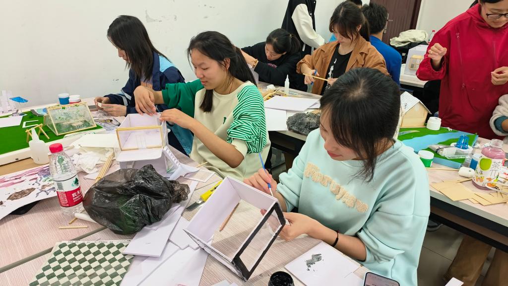 10月21日-10月22日是模型制作环节,模型制作现场犹如一个繁忙的工地,空气中弥漫着颜料、胶水、泡沫板的气味,比赛小组成员们紧张有序地忙碌着,他们运用各种模型工具和材料,将创新的设计理念和精密的工艺技巧融入到每一个模型制作中,他们精心雕刻、切割、打磨、上色和组装,从一块纸板、一根木棒到一栋建筑,从无到有形态精美逼真的“梦想”建筑悄然诞生,整个模型制作现场充满了专注与细致、创意与和谐。