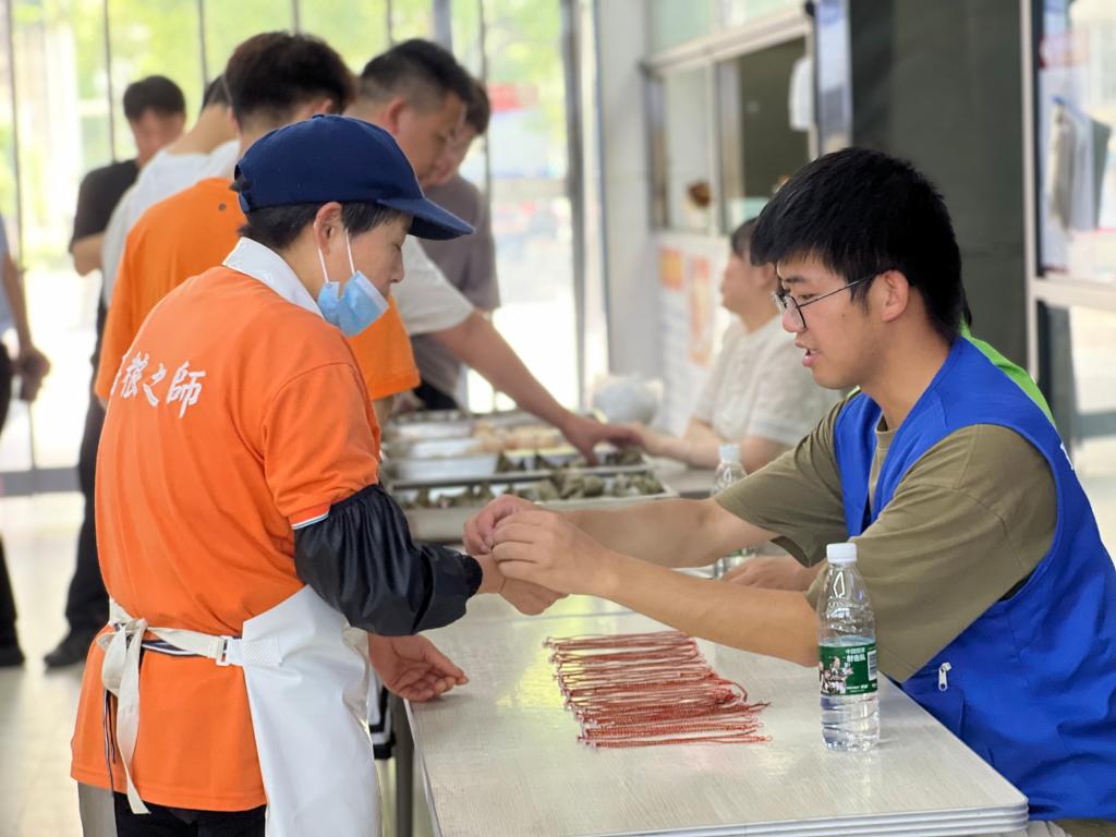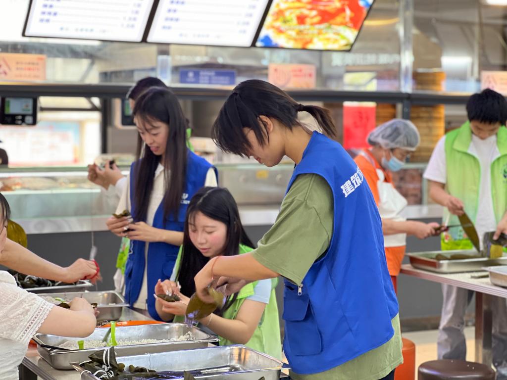 活动中,志愿者们在食堂工作人员的悉心指导下,亲手学习并实践了包粽子这一传统手艺。这不仅是对中国传统手工艺的致敬,更是一次对端午节深厚文化内涵的沉浸式体验。同时,另一项富有特色的活动——编五彩绳也吸引了众多同学的积极参与。活动尾声,志愿者们将亲手包好的粽子和编织的五彩绳送给就餐的师生,向他们传递了节日的温暖与祝福。